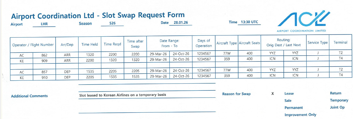 | LHR | S26 | Air Canada | Korean Air | 30-Jan-2026 | 14 | Slot Transfer |