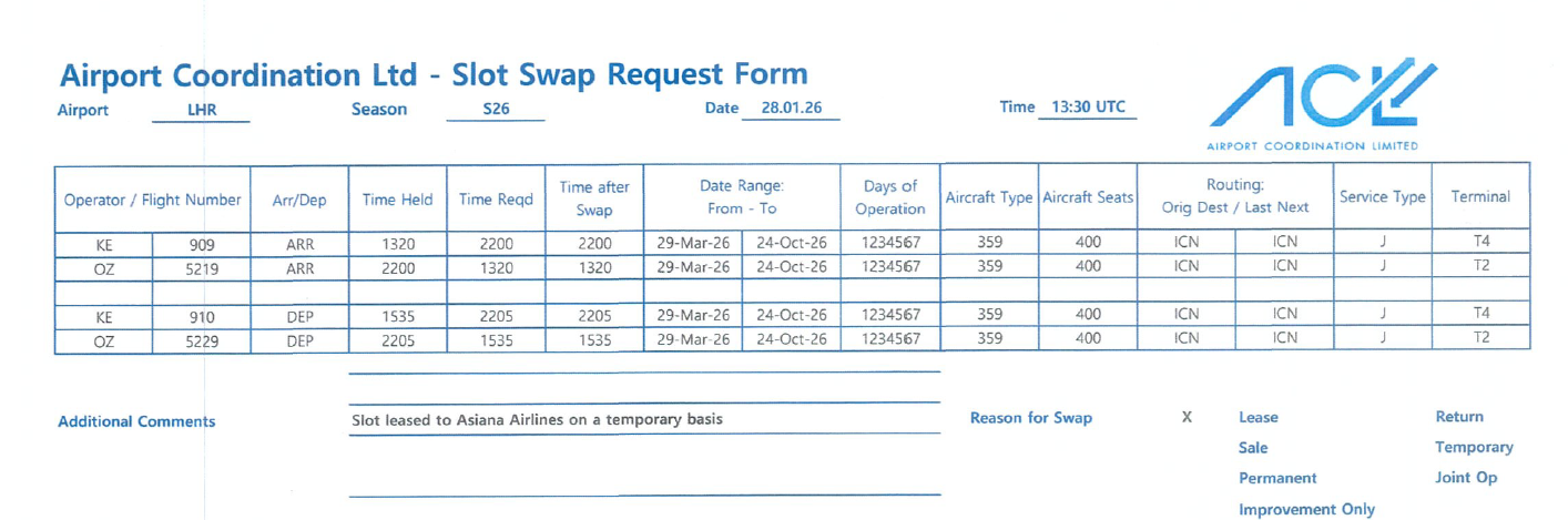 | LHR | S26 | Korean Air | Asiana Airlines Inc | 30-Jan-2026 | 14 | Slot Transfer |