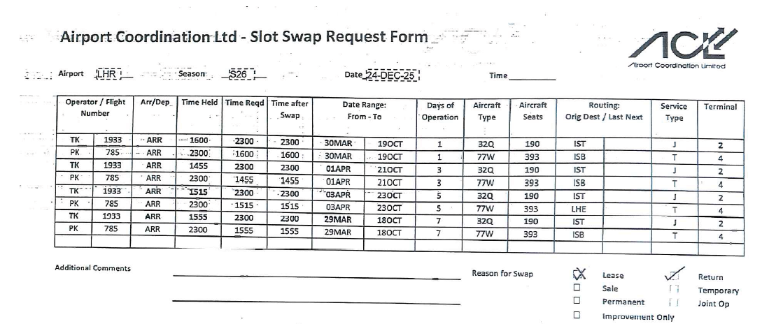 | LHR | S26 | Turkish Airlines | Pakistan International Airlines | 24-Dec-2025 | 8 | Return |