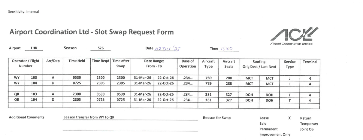 | LHR | S26 | Oman Air | Qatar Airways | 02-Dec-2025 | 6 | lease |